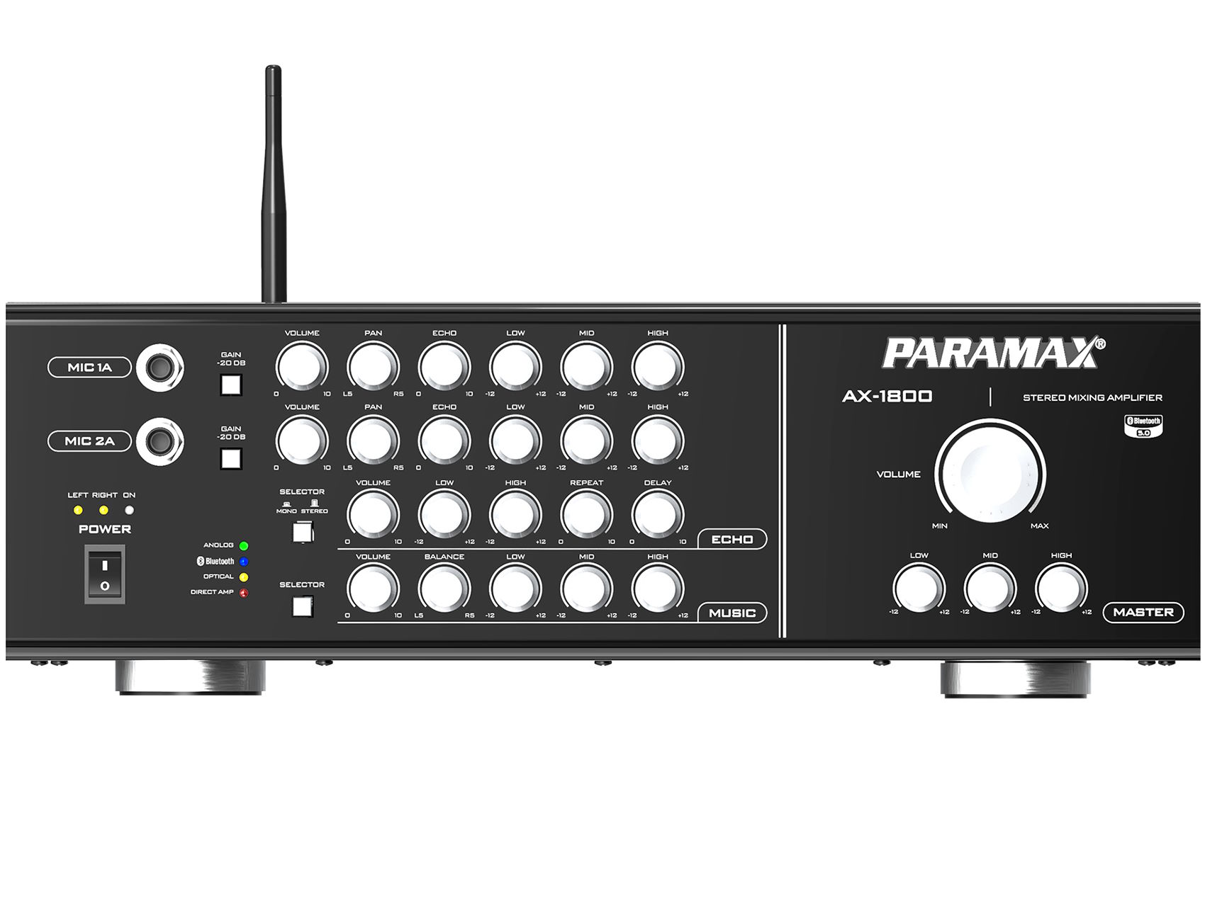 Amply Bluetooth PARAMAX AX-1800 là bộ khuếch đại 2 kênh công suất lớn 700W R.M.S, được thiết kế dành riêng cho nhu cầu karaoke gia đình và giải trí online chuyên nghiệp. Sản phẩm nổi bật với khả năng xử lý và khuếch đại tín hiệu âm nhạc gần như nguyên vẹn từ nguồn phát, mang đến nhạc nền mạnh mẽ, chi tiết, cùng giọng hát đầy đặn và thăng hoa.