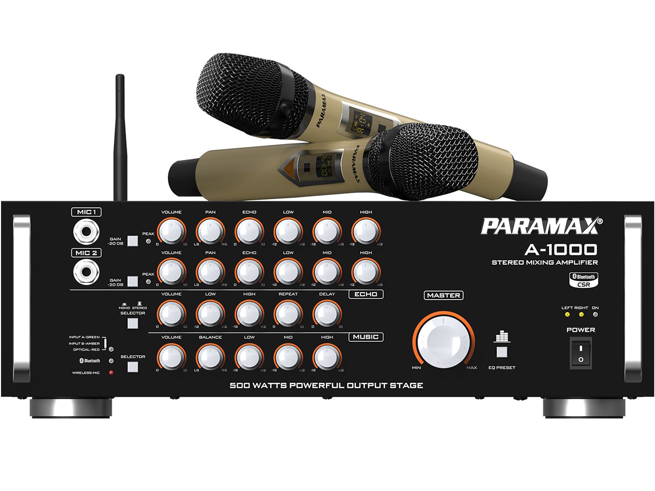 Với thiết kế hiện đại, công suất mạnh mẽ 500W, tích hợp micro không dây UHF cao cấp cùng khả năng kết nối Bluetooth aptX và Optical tiện lợi, Paramax A-1000 mang đến trải nghiệm karaoke chuyên nghiệp ngay tại nhà.