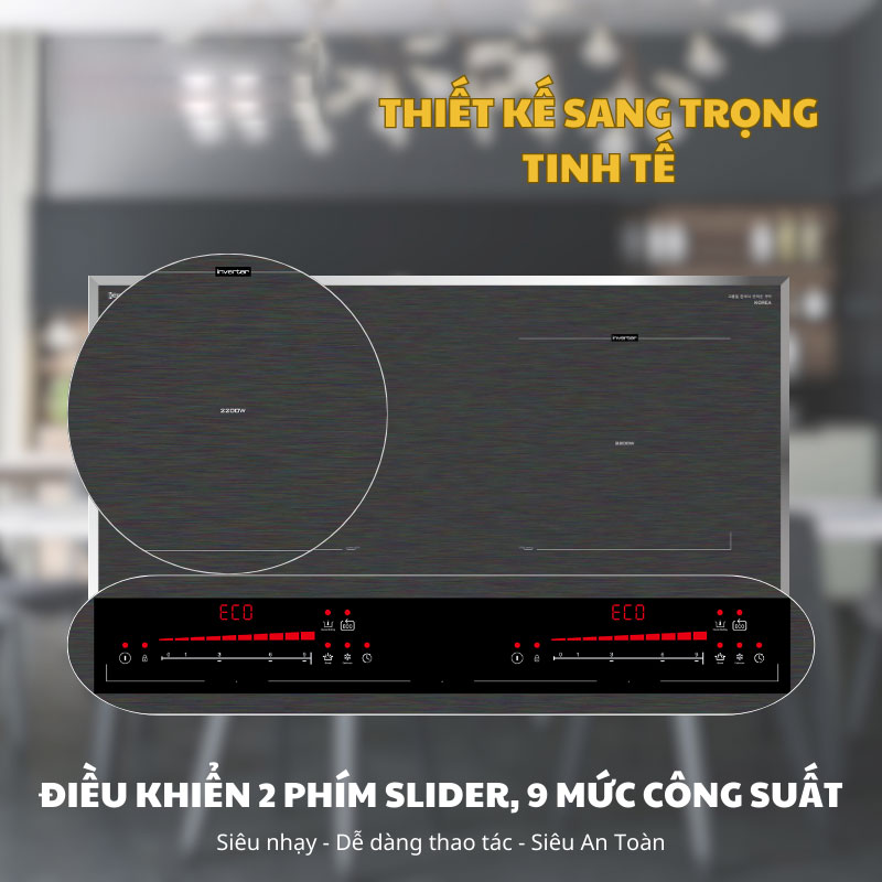 - Điều khiển cảm ứng dạng trượt (Slider) với 9 mức công suất tiện lợi.