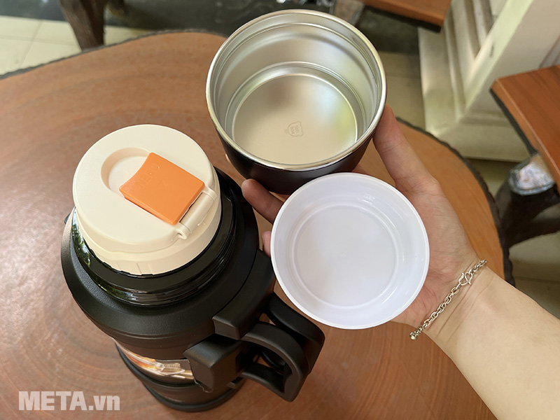 Nắp ngoài của phích được thiết kế hai lớp giúp giữ nhiệt tốt hơn và có thể tháo rời để sử dụng như một chiếc cốc uống tiện lợi.