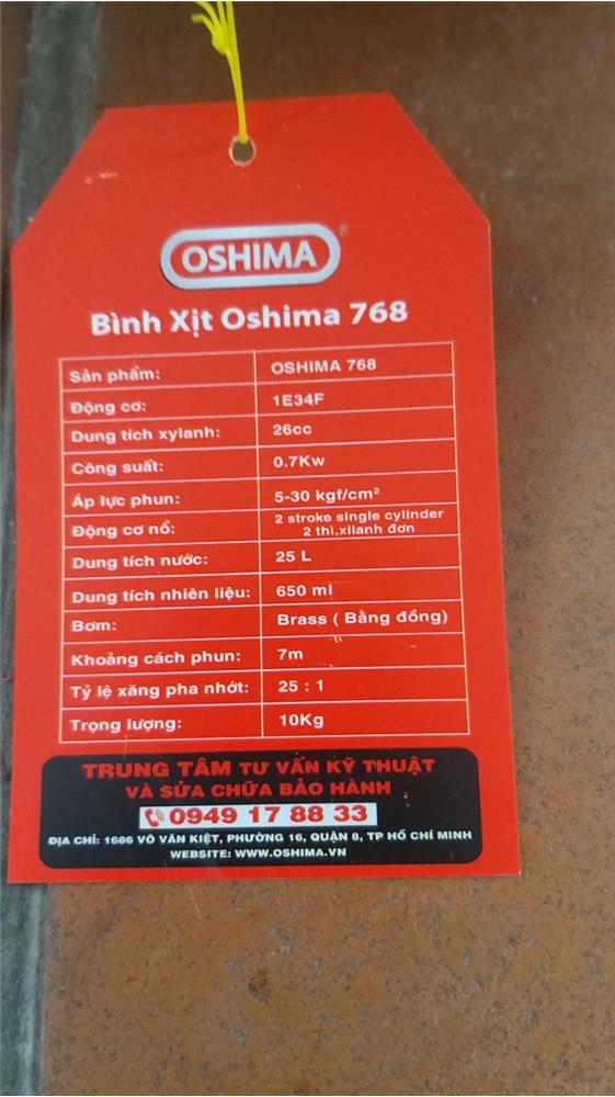 Oshima 768 có dung tích bình chứa 25 lít, sản phẩm sử dụng động cơ 2 thì với nhiên liệu xăng pha nhớt tỉ lệ 25:1