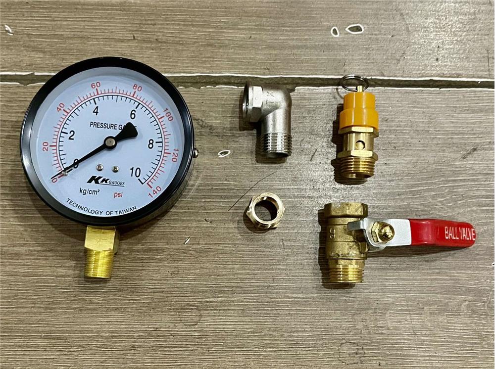 Bình tích khí Pegasus 120L đi kèm van an toàn, van xả và đồng hồ áp.