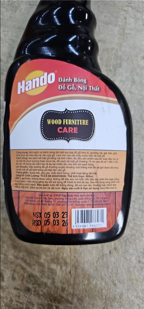 Hiện nay ở nhiều gia đình Việt luôn có sở thích chọn đồ nội thất làm từ chất liệu gỗ, đáp ứng nhu cầu làm sạch và đánh bóng những đồ gỗ nội thất, nhà sản xuất cho ra đời sản phẩm bình làm sạch và đánh bóng đồ gỗ Hando 600ml với hoạt chất làm sạch đặc biệt này sẽ giúp tẩy sạch những vết bụi bám lâu ngày.