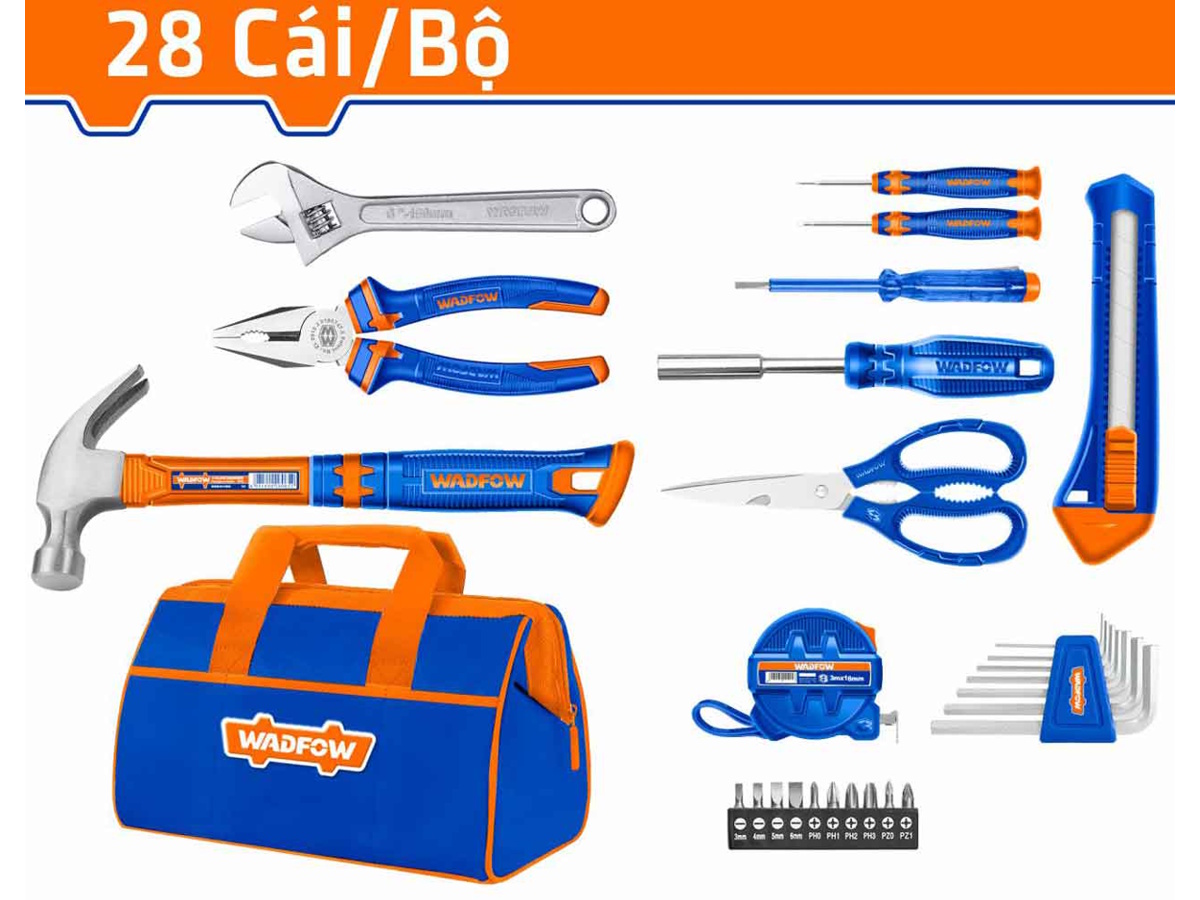 WadFow WHS1M28 được thiết kế với 28 dụng cụ cầm tay thiết yếu, phù hợp cho cả công việc sửa chữa gia đình và các thao tác kỹ thuật cơ bản. Bộ sản phẩm bao gồm thước kéo thép 3m x 16mm, kìm răng 6 inch, kéo 8 inch, mỏ lết răng 6 inch, búa nhổ đinh mini 8oz và lưỡi dao 18mm. Nhờ đó, người dùng có thể dễ dàng đo đạc, cắt vật liệu, siết mở chi tiết hoặc thực hiện nhiều công việc sửa chữa khác nhau chỉ với một bộ dụng cụ.