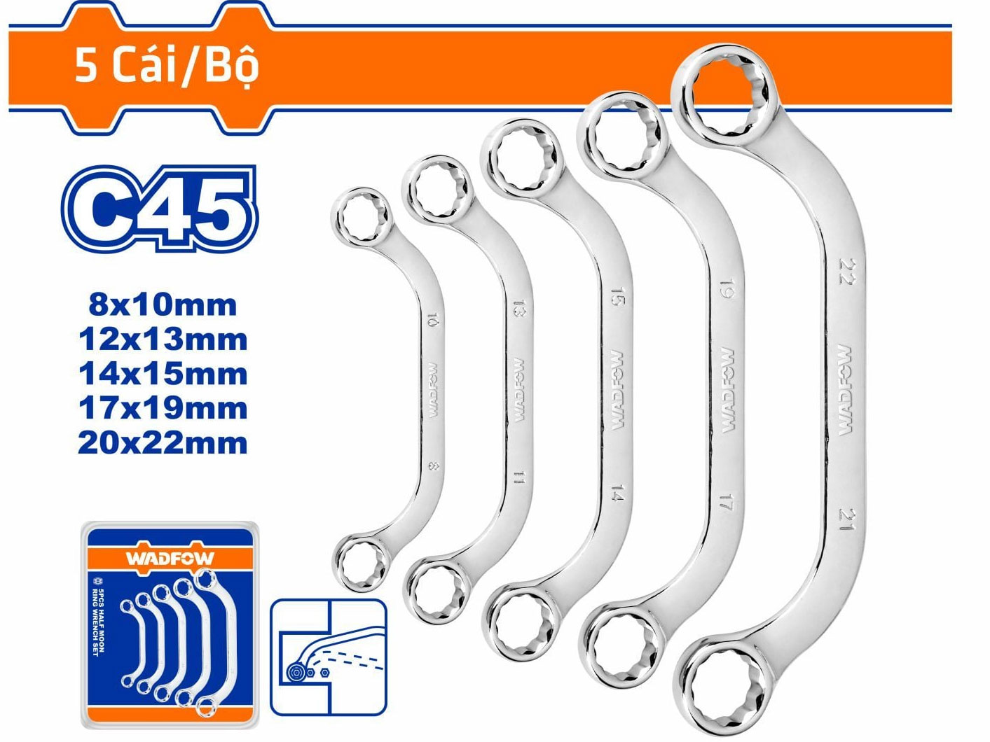Bộ 5 cờ lê WadFow WFR3405 với thiết kế vòng bán nguyệt, kích thước từ 8mm đến 22mm, bề mặt đánh bóng, chất liệu thép carbon 45#, giúp thao tác chắc chắn, an toàn.