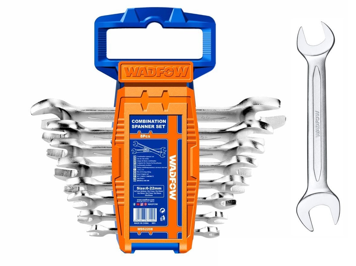 Bộ 8 cờ lê 2 đầu miệng Wadfow WDS2208 thích hợp sử dụng trong ngành cơ khí, sửa chữa máy móc, lắp ráp thiết bị hoặc các công việc cần thao tác với ốc vít và bu lông. Sản phẩm được đóng gói bằng móc nhựa, giúp sắp xếp các cờ lê gọn gàng và thuận tiện khi treo hoặc bảo quản trong khu vực làm việc.