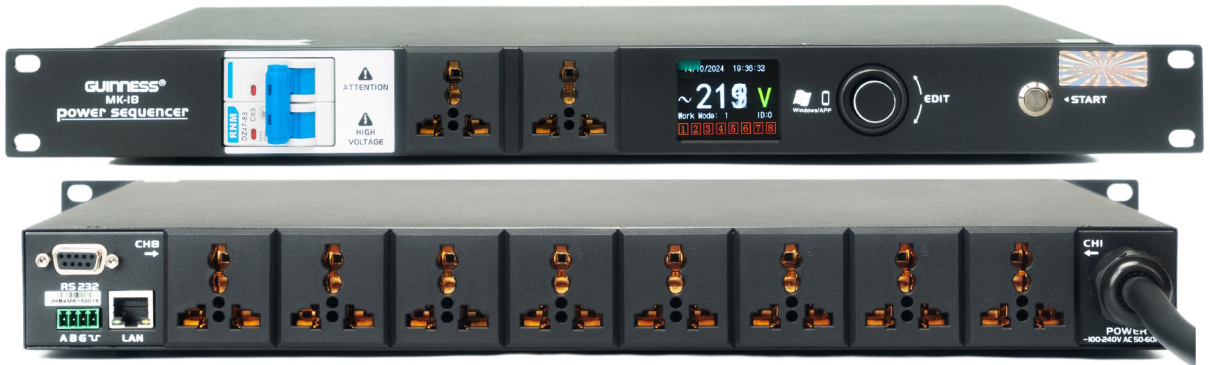 Bộ quản lý nguồn điện AC GUINNESS MK-18 được trang bị màn hình LCD màu 2 inch, hiển thị điện áp, ngày giờ và trạng thái từng kênh theo thời gian thực. Thiết bị có tổng cộng 10 cổng kết nối, trong đó 8 cổng ở mặt sau và 2 cổng ở mặt trước. Mỗi kênh có thể cài đặt thời gian bật/tắt từ 0 đến 999 giây, tối ưu hóa quy trình khởi động và tắt thiết bị, đảm bảo hệ thống vận hành ổn định.