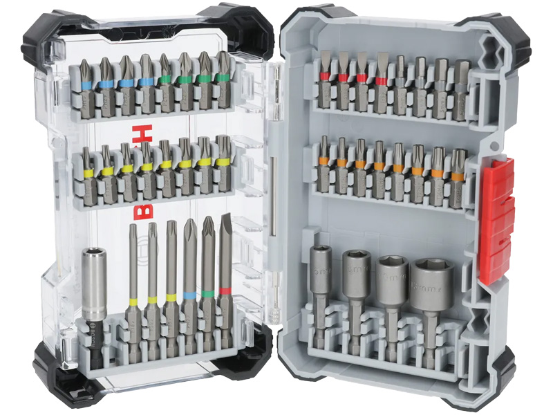 - 25 mm Screwdriver Bit: PH1; PH2 (2x); PH3; PZ1; PZ2 (2x); PZ3; T10; T15; T20 (2x); T25; T27; T30; T40; T10H; T15H; T20H (2x); T25H; T27H; T30H; T40H; H3; H4; H5; H6; SL3; SL4; SL5; SL6.