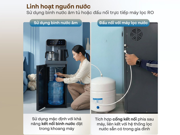 - Kết nối trực tiếp hệ thống lọc nước RO tại nhà thông qua cổng kết nối phía sau máy