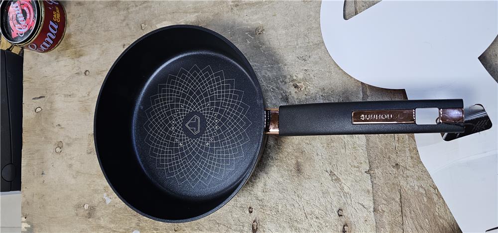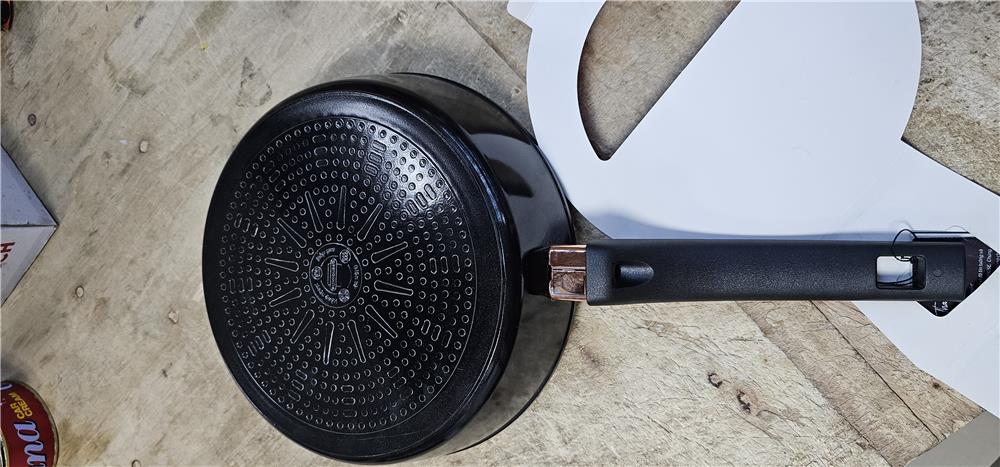 Phần tay cầm được ốp mạ vàng đầy tinh tế, đẳng cấp. Đáy chảo được cấu tạo đa lớp dập liền chống phồng đáy.