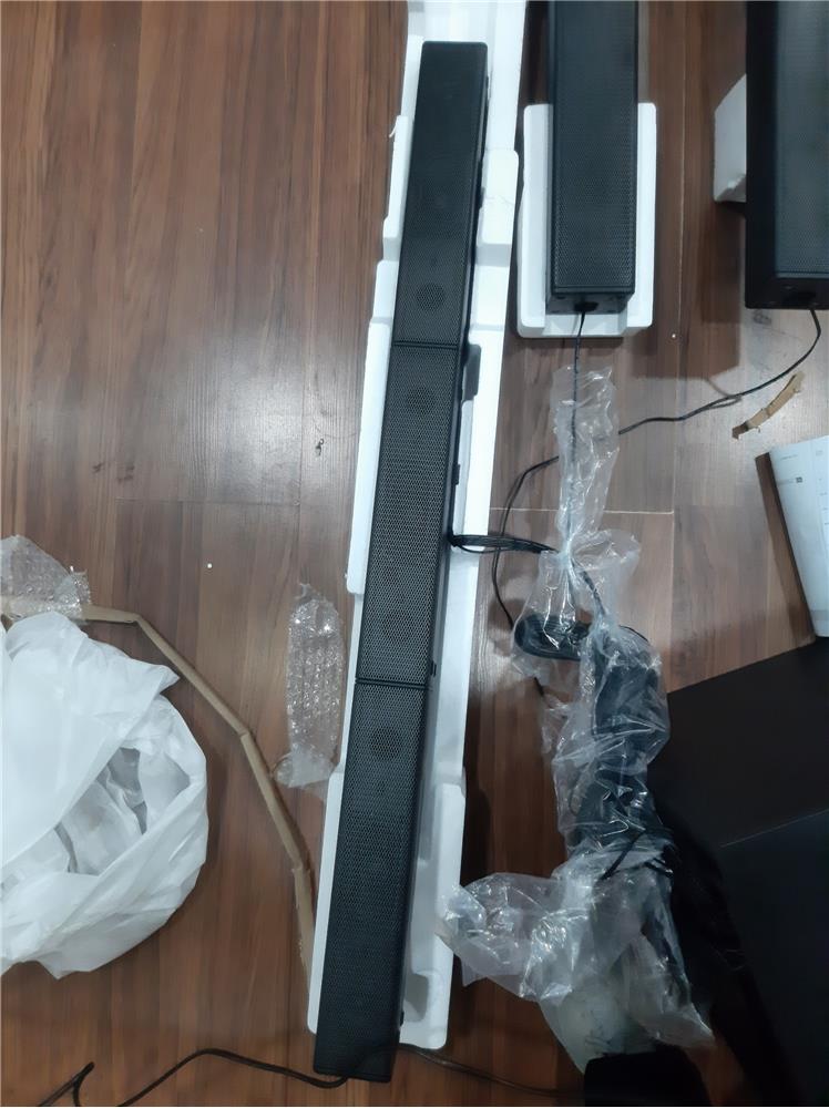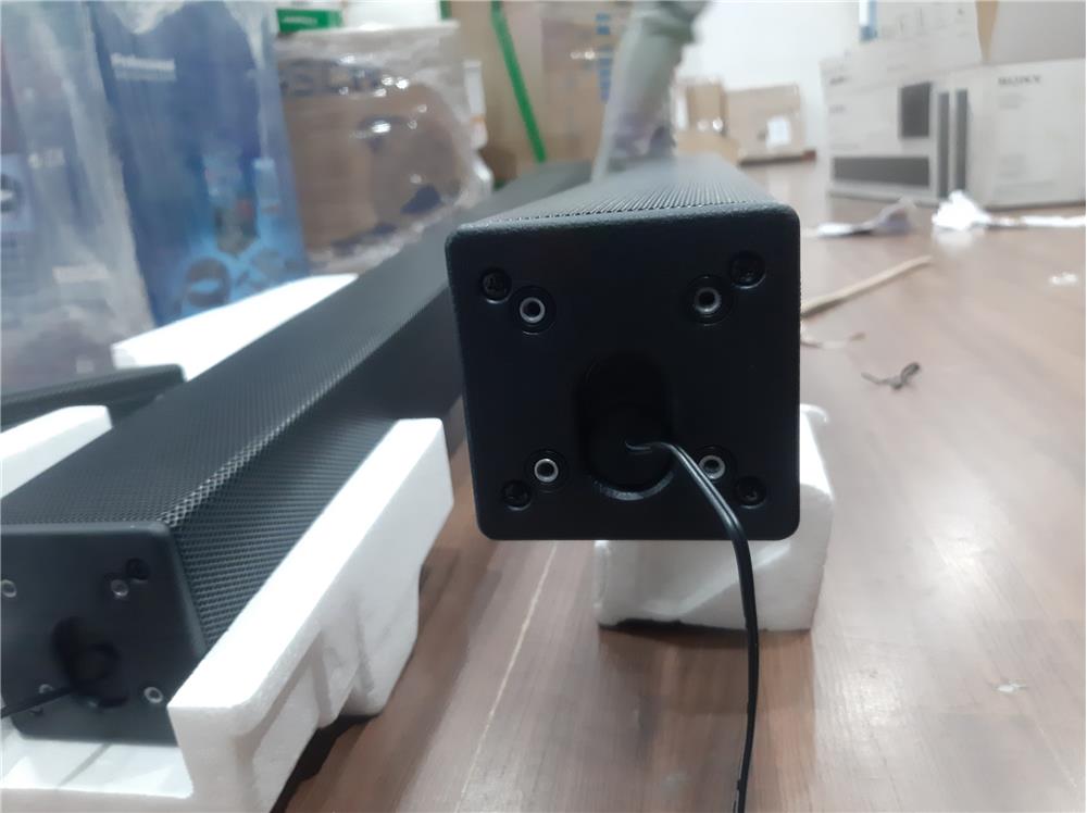 - 1 thanh loa ngang chính có hình chữ nhật nằm ngang giống như những chiếc loa soundbar truyền thống. Loa này được đặt nằm ngang đối diện với người nghe, thường được bố trí ở phía trước tivi. Chiều dài thanh loa là 90cm, mặt ngoài được bọc vỏ lưới giúp bạn dễ dàng lau chùi, vệ sinh.