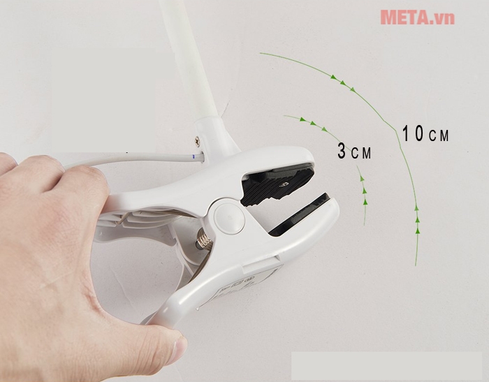 Phần kẹp bàn được đệm bằng miếng lót cao su cứng, có khứa giúp ma sát tốt hơn, phù hợp để kẹp bàn mà không làm tổn thương bề mặt. Công tắc On/Off bằng nút cảm ứng mang đến sự tiện nghi khi sử dụng.