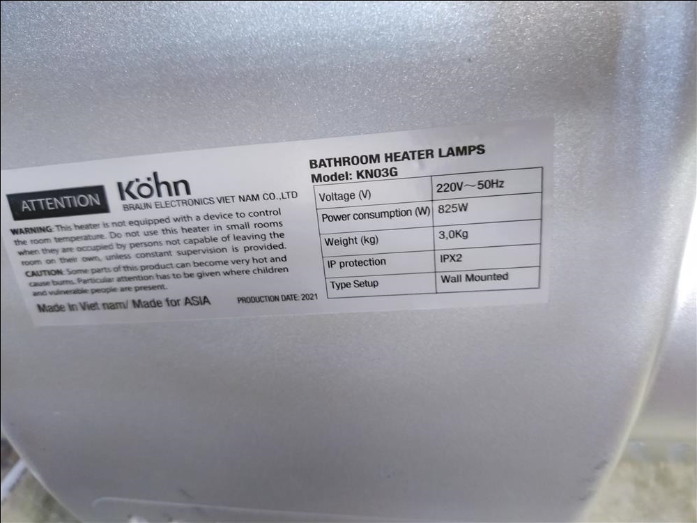 KN03G là dòng đèn sưởi nhà tắm Kohn có công suất khá lớn. Máy gồm có 3 bóng đèn sưởi hồng ngoại, mỗi bóng có công suất 275W, tổng công suất lên đến 825W, phù hợp cho không gian có diện tích từ 4 - 6m2.