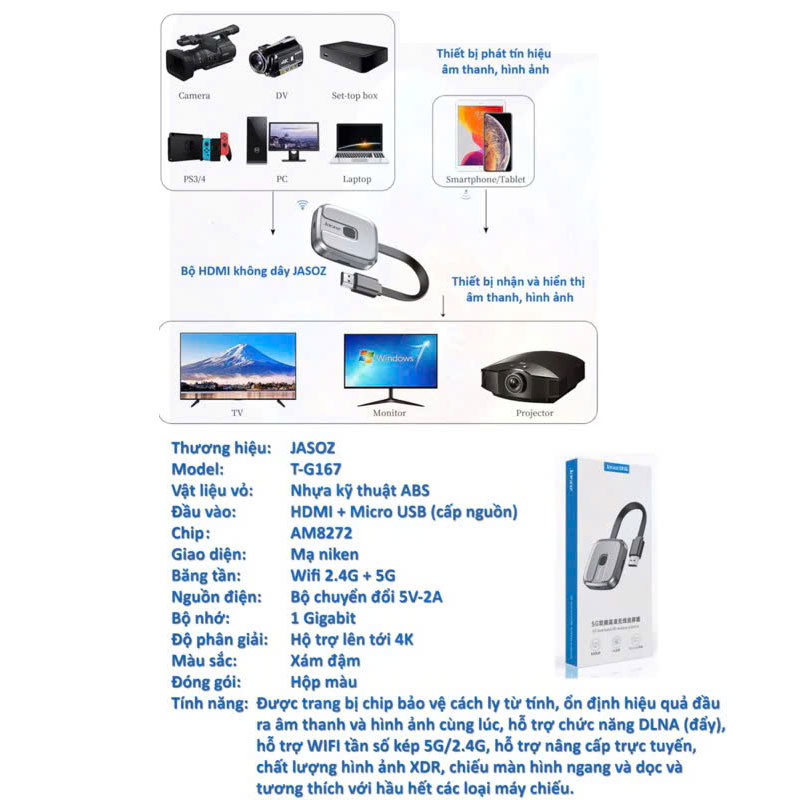 HDMI không dây 4K Jasoz T-G167 hỗ trợ phân giải lên tới 4K ở 30Hz, kết nối Wi-Fi kép 2.4 GHz/5 GHz ổn định, tương thích đa nền tảng, giúp truyền tải hình ảnh và âm thanh không dây chất lượng cao.
