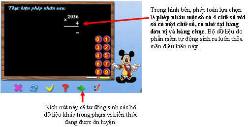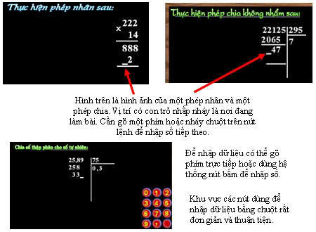 4. Một trong các đặc thù rất mạnh của phần mềm là tất cả các dạng toán đều được mô phỏng sao cho học sinh có thể làm theo từng bước chính xác như khi làm trên giấy trên lớp cũng như ở nhà. Vị trí cần điền số hiện thời của phép tính sẽ được đánh dấu bởi một con trỏ nhấp nháy. Học sinh chỉ việc gõ một phím số hay dùng chuột nháy một nút nhỏ là có thể điền được giá trị cần điền. Ngay lập tức con trỏ sẽ chuyển sang vị trí tiếp theo cần điền tiếp. Cứ như vậy, phần mềm sẽ dẫn dắt các em làm bài hay ôn luyện theo từng bước giúp các em hiểu bài nhanh chóng.