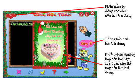 6. Phần mềm được thiết kế hoàn toàn phù hợp với tâm lý lứa tuổi học sinh mẫu giáo tiểu học. Giao diện đẹp mắt và hoàn toàn bằng tiếng Việt. Chức năng tự động cho điểm đánh giá học tập của học sinh. Với từng bài, phần mềm có chức năng kiểm tra động viên nhắc nhở bằng những hình ảnh âm thanh ngộ nghĩnh. Nếu làm bài đúng nhiều món quà hấp dẫn sẽ xuất hiện bất ngờ gây sự hứng thú và tạo thư giãn trong khi học tập.