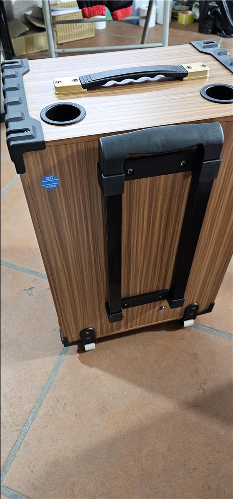 Thùng loa dán vân gỗ cho độ bền cao, hạn chế ẩm mốc. Loa di động có kiểu dáng như chiếc vali kéo: Có cần kéo, 2 bánh xe và chân đế cố định.