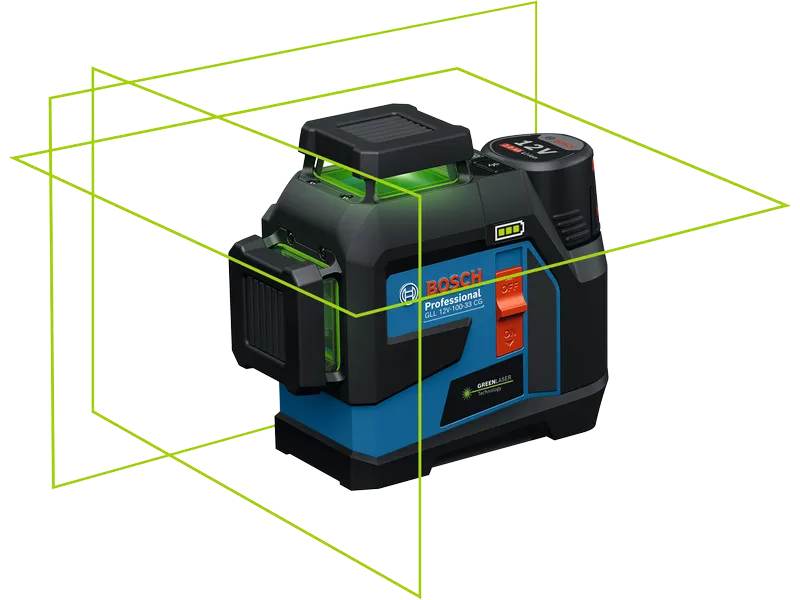 Máy cân bằng laser Bosch GLL 100-33 CG được trang bị 3 đường laser 360 độ (tổng cộng 12 tia xanh) có bước sóng từ 500nm - 540nm sẽ cho độ sáng gấp 4 lần tia đỏ, đảm bảo hiển thị rõ ràng trong môi trường có ánh sáng mạnh.