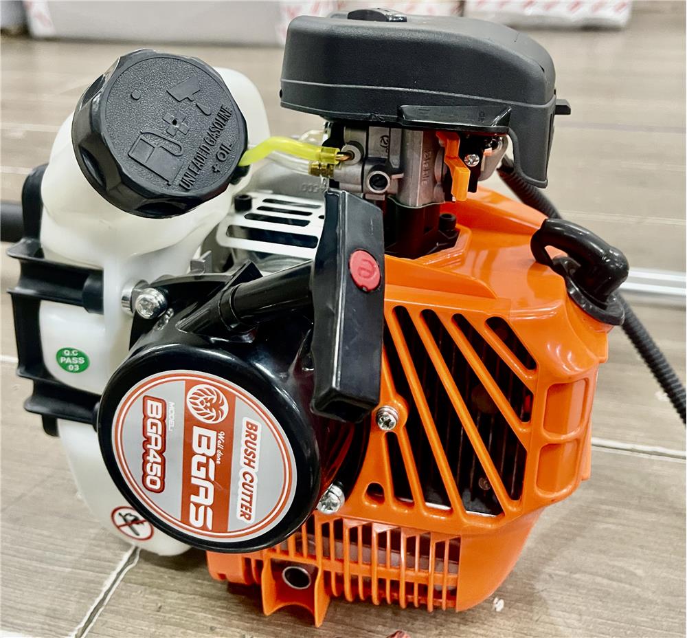 Máy cắt cỏ Bgas BGA450 dùng động cơ xăng 2 thì với nhiên liệu xăng pha nhớt, dễ dàng cắt cỏ ở những khu vực không có nguồn điện.