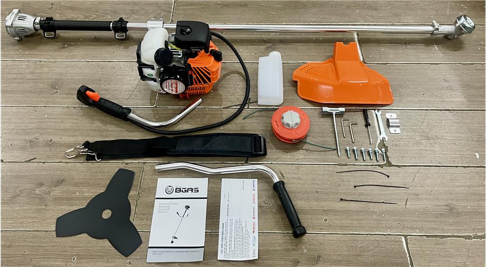 Bgas BGA450 có kiểu dáng đeo vai chắc chắn, dễ dàng thao tác. Máy cắt cỏ đi kèm tay cầm, bắt bát cước, lưỡi cắt, chắn bảo vệ, dây đeo.