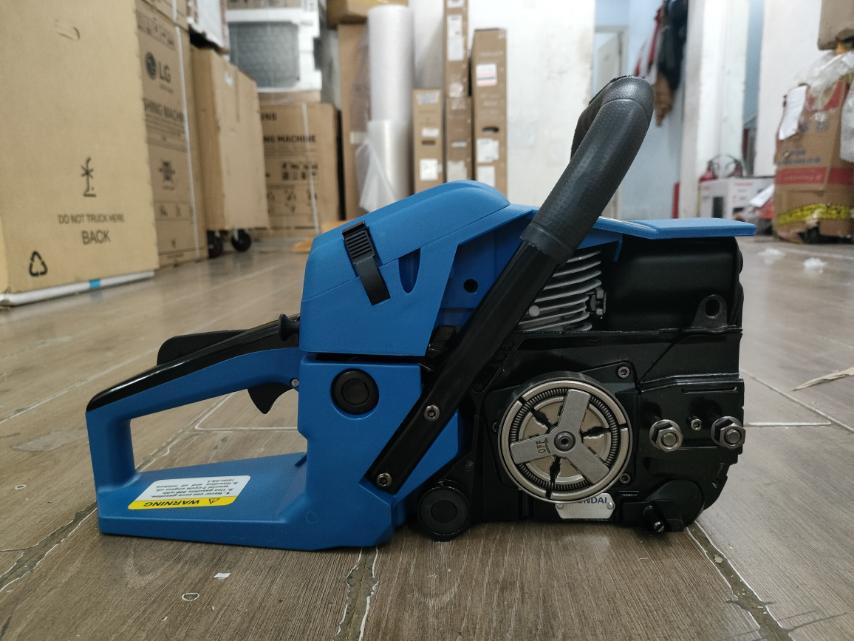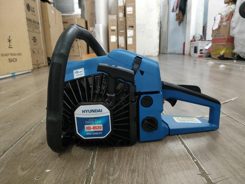 - Máy cưa xích Hyundai HD-8520 khởi động giật tay dễ nổ, trọng lượng máy chỉ nặng 7kg, dễ dàng di chuyển và thao tác làm việc.