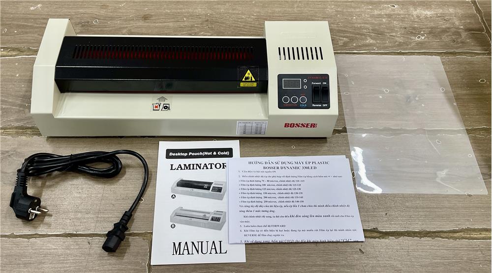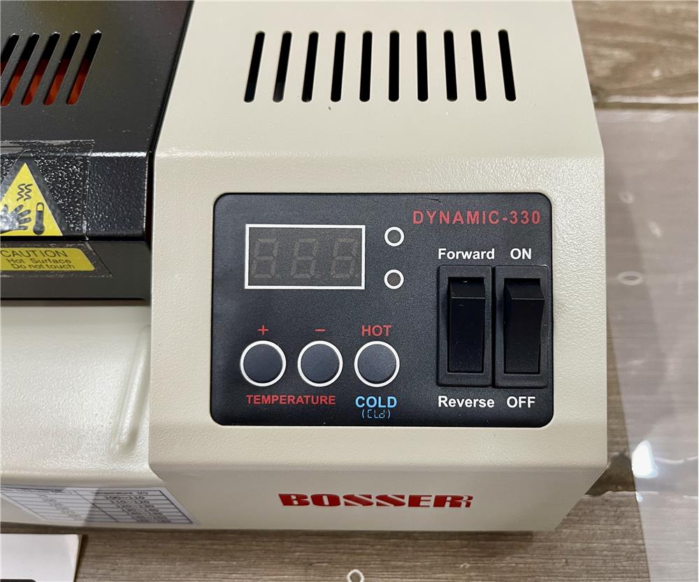 - Bosser Dynamic 330LED có khả năng ép khổ giấy A3 - 330mm với tốc độ ép nhanh đạt 600 mm/phút.
