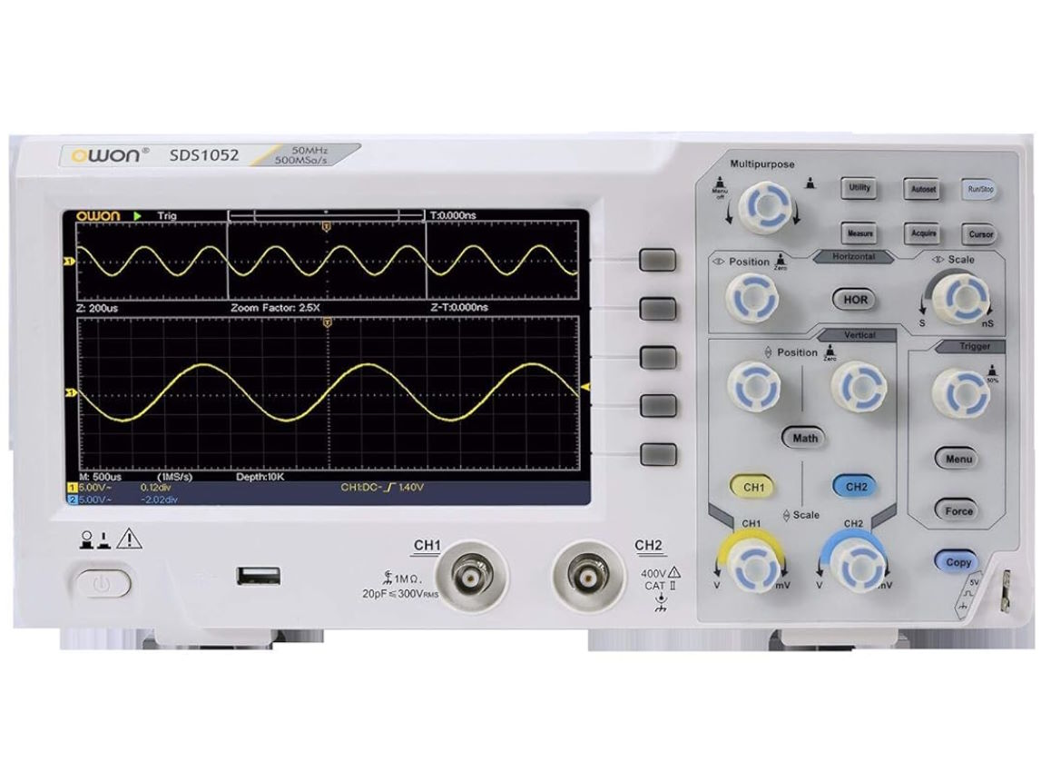 Máy hiện sóng kỹ thuật số OWON SDS1052 là thiết bị đo lường đáng tin cậy, được thiết kế dành cho kỹ sư, kỹ thuật viên, sinh viên ngành điện – điện tử và những người đam mê nghiên cứu mạch. Với băng thông 50 MHz, tốc độ lấy mẫu 500 MS/s cùng 2 kênh đo độc lập, sản phẩm đáp ứng tốt nhu cầu phân tích tín hiệu từ cơ bản đến trung bình mà không cần đầu tư vào các dòng máy cao cấp, chi phí lớn.