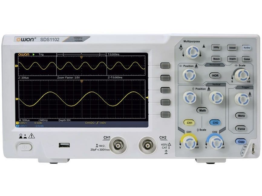 Máy hiện sóng Owon SDS1102 là thiết bị đo lường điện tử chuyên dụng, đáp ứng tốt nhu cầu nghiên cứu, giảng dạy và sửa chữa mạch điện tử. Với băng thông 100 MHz, 2 kênh đo độc lập và tốc độ lấy mẫu 1 GS/s, sản phẩm cho khả năng hiển thị và phân tích dạng sóng nhanh, rõ ràng và chính xác.