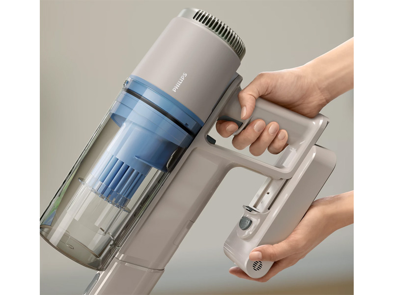 Máy hút bụi cầm tay Philips này có dạng đứng kết hợp tay cầm, cho phép người dùng thay đổi linh hoạt giữa hai kiểu sử dụng. Khi lắp thân máy với ống nối, thiết bị hoạt động như một máy hút bụi sàn, phù hợp cho việc làm sạch các bề mặt sàn trong nhà. Khi tháo rời khỏi ống nối, máy có thể sử dụng ở dạng cầm tay để vệ sinh bàn ghế, sofa, đệm, kệ tủ hoặc nội thất xe ô tô, đáp ứng nhiều nhu cầu làm sạch khác nhau trong sinh hoạt hằng ngày.