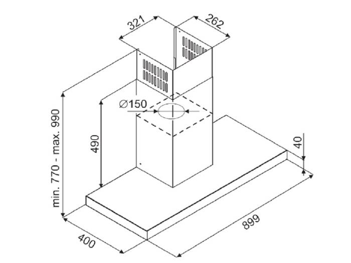 Máy hút mùi Fagor 3CFS-9032X có thiết kế tinh tế với màu kính đen, phù hợp với nhiều phong cách bếp hiện đại. Kích thước rộng 900mm, sâu 400mm và chiều cao có thể điều chỉnh từ 840mm đến 990mm, giúp dễ dàng lắp đặt trong các không gian bếp. Máy có trọng lượng 21.6kg, chắc chắn và bền bỉ trong suốt quá trình sử dụng.