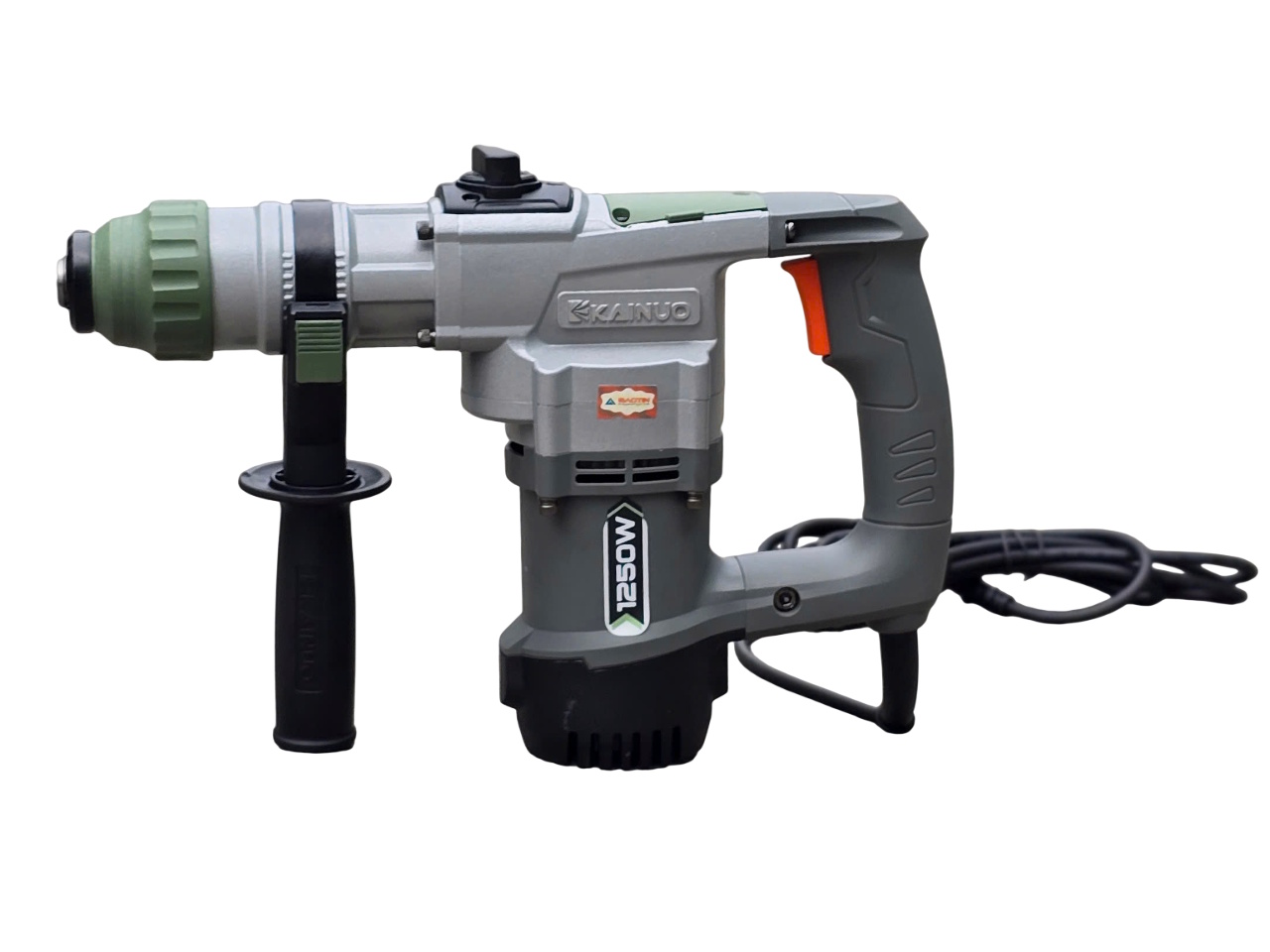 Kainuo 8268G được thiết kế cứng cáp với thân máy chắc chắn, màu xám – cam nổi bật. Tay cầm chính kết hợp tay cầm phụ giúp người dùng thao tác ổn định, giảm rung khi khoan hoặc đục bê tông. Trọng lượng khoảng 7kg giúp máy đầm tay, phù hợp cho công việc thi công liên tục.