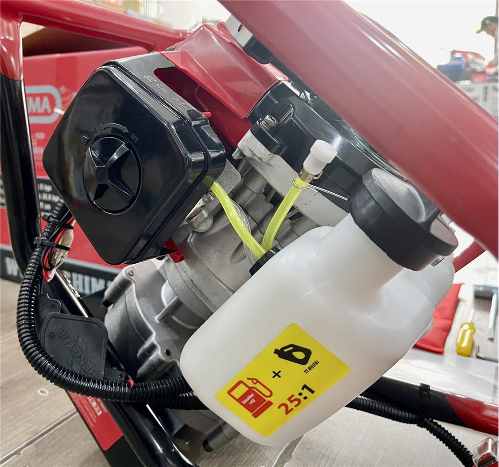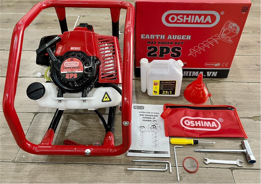 Máy khoan đất Oshima 2PS đi kèm bình pha, phễu, bịch phụ tùng: chìa khóa, khóa mở bugi