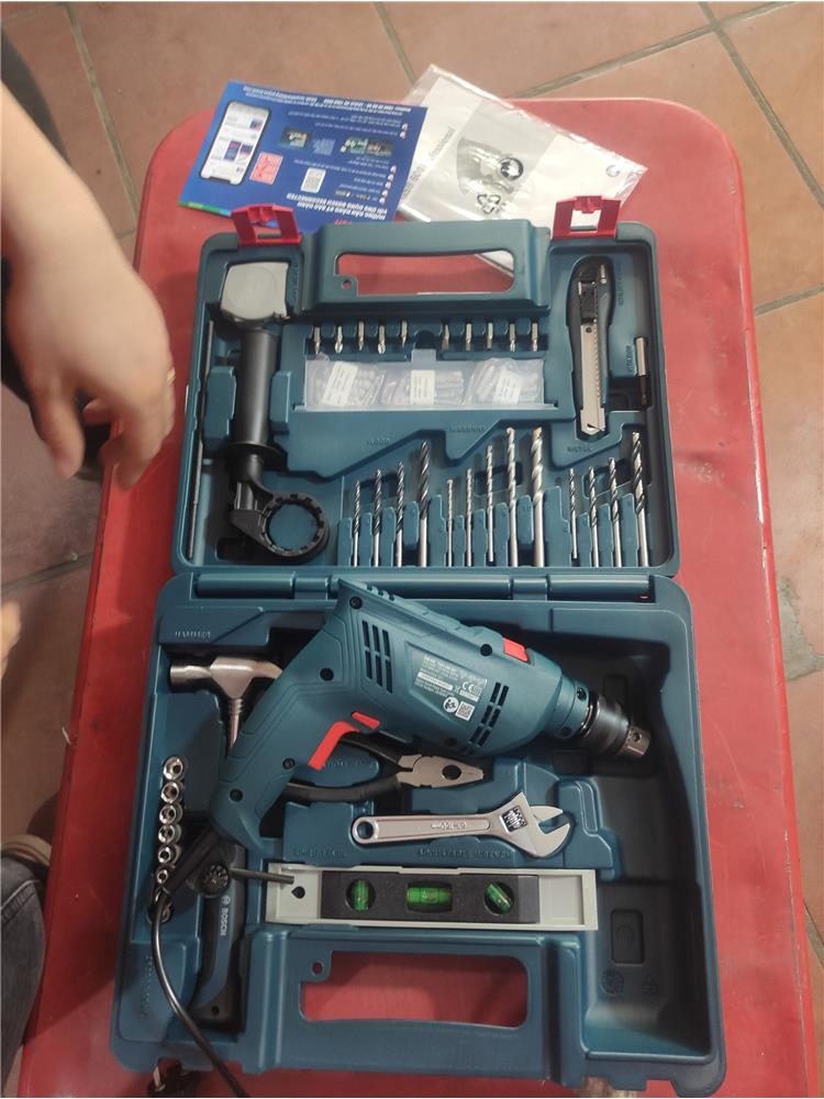 - Bosch GSB 600 06011A03K1 đi kèm bộ set 100 món: Búa, mũi khoan, kìm... giúp hỗ trợ được nhiều công việc khác nhau.