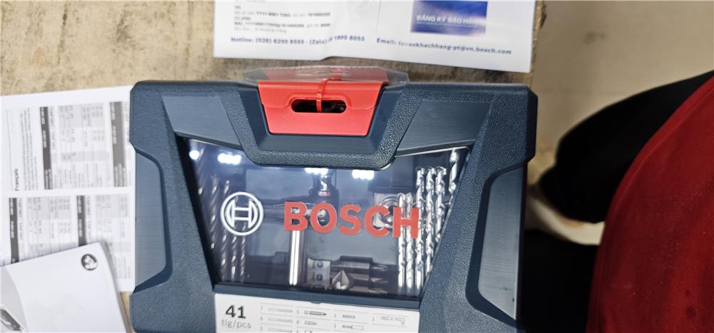 Hộp phụ kiện 41 món gồm có các mũi khoan, đầu bắt vít, bu lông rất tiện ích và đa năng.