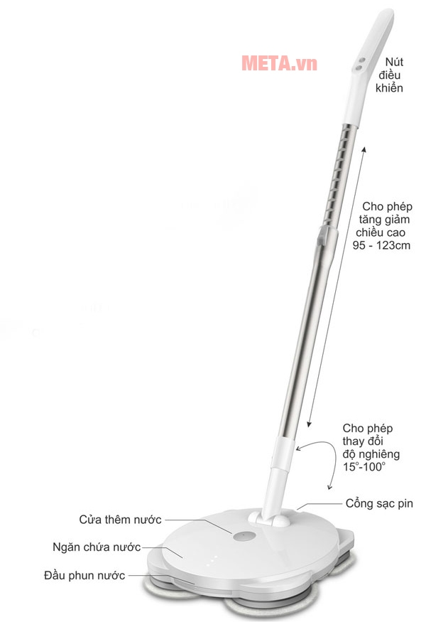 - Tay cầm cho phép điều chỉnh độ cao và độ nghiêng để phù hợp với vóc dáng từng người và từng vị trí lau.