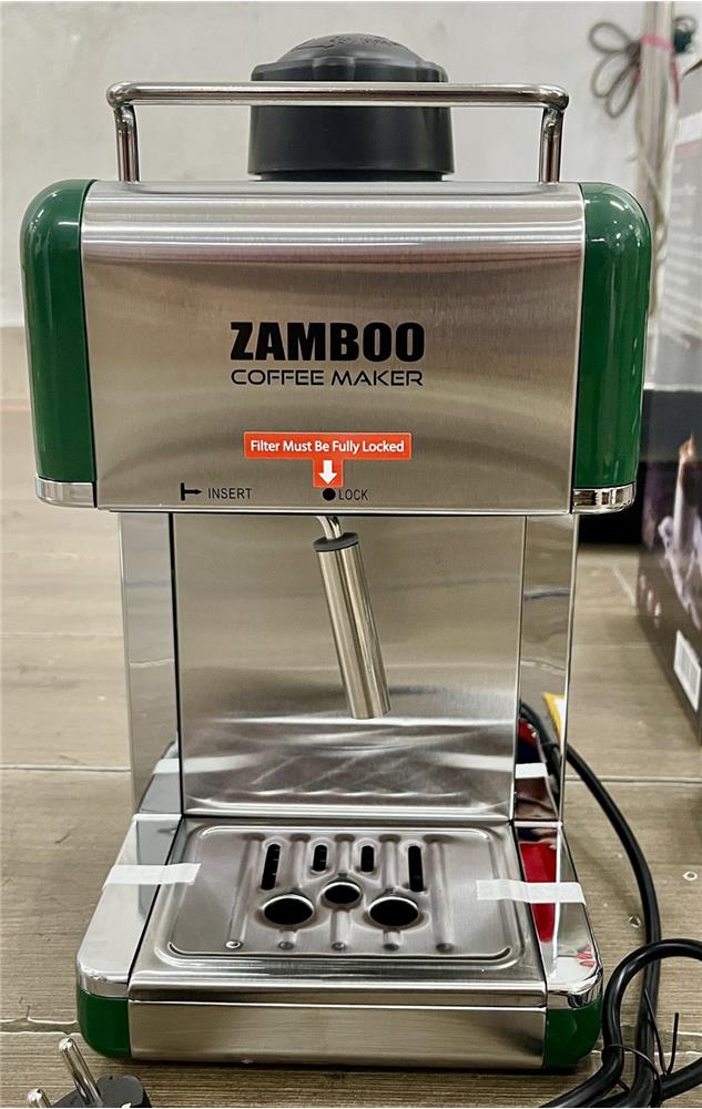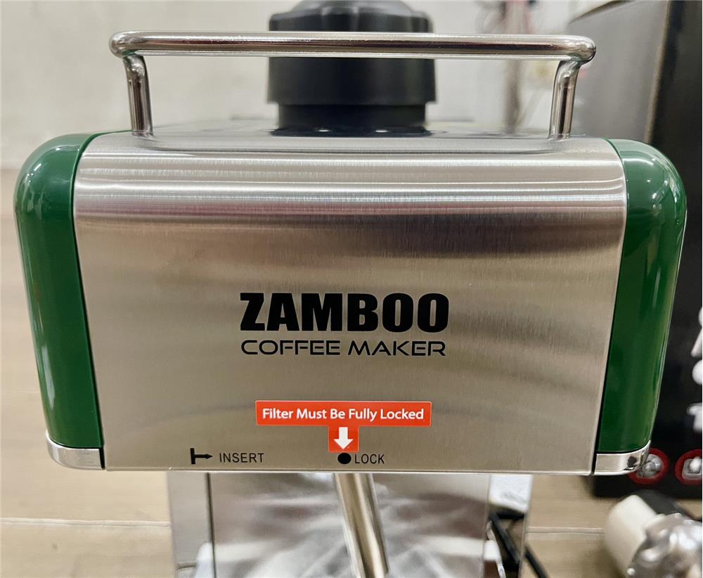 Máy pha cà phê Zamboo có công tắc tắt/mở riêng, núm điều khiển hiển thị dễ dàng với đèn Led xanh. Tay phin lọc được làm từ nhôm. Vòi đánh sữa bằng inox dễ tháo rời. Phin lọc inox có thể chứa khoảng 20g cà phê bột.