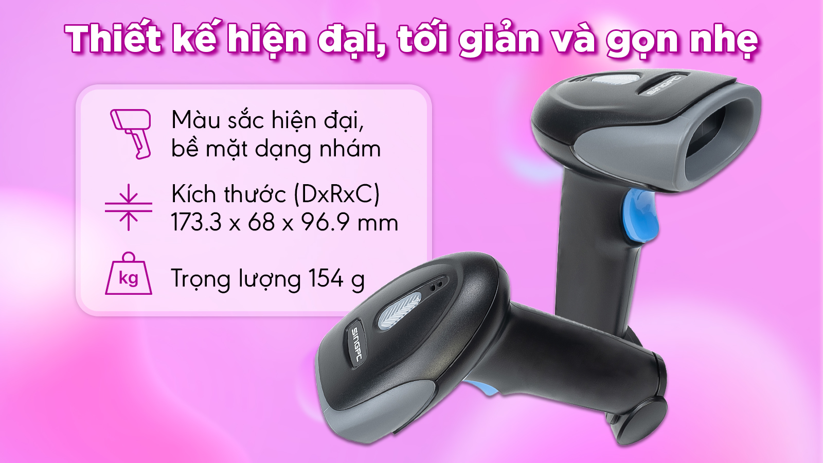 SingPC Scan-2623TR sở hữu thiết kế nhỏ gọn, chắc chắn với phần vỏ nhựa cứng bền bỉ, khả năng chịu va đập khi rơi từ độ cao dưới 1.5m. Máy có kích thước 173.3mm x 68mm x 96.9mm và trọng lượng chỉ 154g giúp người dùng dễ dàng cầm nắm và sử dụng trong thời gian dài mà không lo bị mỏi tay. Với thiết kế này, SingPC Scan-2623TR trở thành lựa chọn lý tưởng cho các quầy thu ngân, siêu thị và các khu vực cần quét mã vạch liên tục.