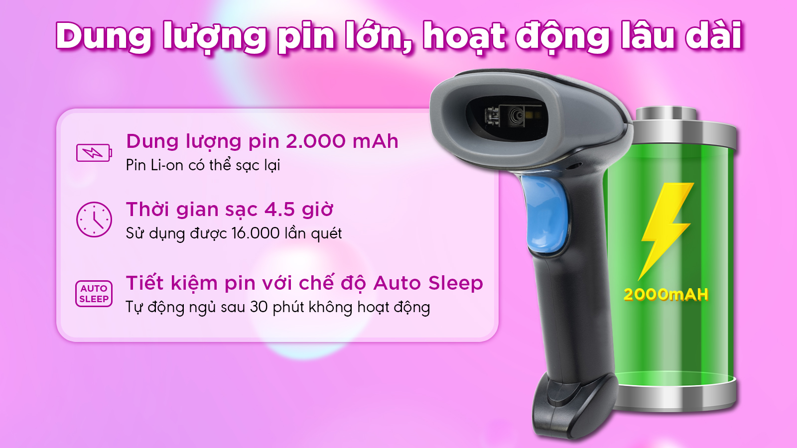 - Tiết kiệm năng lượng: Pin Li-ion 2.000 mAh có thể sạc lại, sử dụng lâu dài với 16.000 lần quét sau mỗi lần sạc.