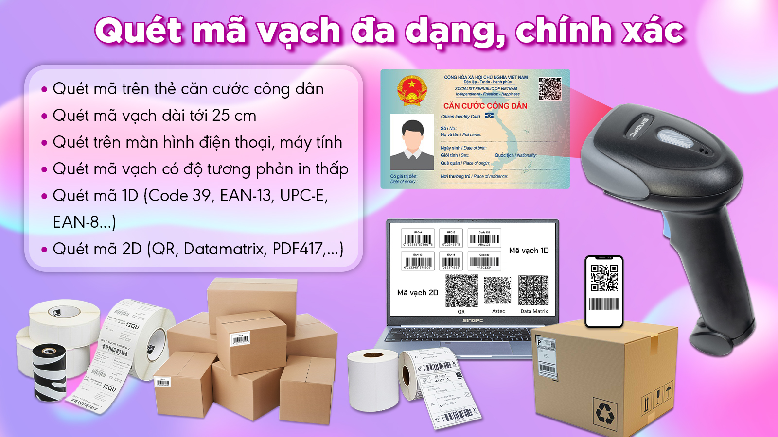 - Khả năng quét đa dạng: Quét được mã vạch 1D, 2D và mã QR trên nhiều bề mặt, bao gồm cả màn hình điện thoại và máy tính.