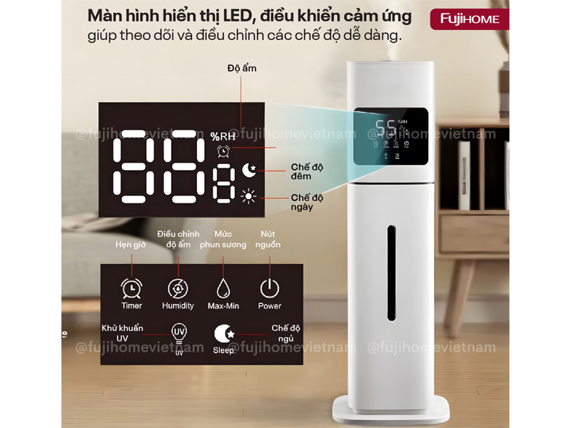 Máy tạo độ ẩm Fujihome HM09UV2 được trang bị màn hình LED hiển thị độ ẩm rõ ràng và cảm ứng thông minh, giúp điều chỉnh độ ẩm dễ dàng chỉ bằng một thao tác.