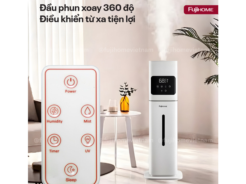 Máy có phạm vi điều chỉnh độ ẩm từ 40% đến 90% đáp ứng mọi nhu cầu sử dụng, từ phòng ngủ yên tĩnh đến không gian làm việc năng động. Sản phẩm cũng đi kèm điều khiển từ xa, giúp bạn tiện lợi điều chỉnh mà không cần di chuyển.