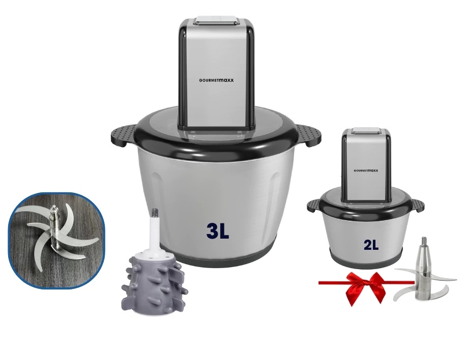 Máy xay thịt Gourmetmaxx đi kèm cối inox 3 lít có khả năng xay tối đa 1kg thịt mỗi mẻ, rất phù hợp cho gia đình và các cơ sở kinh doanh nhỏ. Ngoài ra, bạn còn được tặng bộ cối xay 2L, dao inox 4 lá và nắp, giúp bạn dễ dàng điều chỉnh lượng nguyên liệu xay mỗi mẻ.