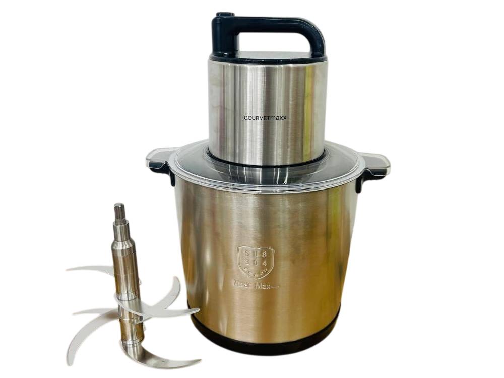 Máy xay thịt Gourmetmaxx có phần thố làm hoàn toàn bằng inox 304 dày dặn, bền bỉ, không bị gỉ sét khi tiếp xúc với thực phẩm ẩm ướt. Các dao xay được làm từ inox, gồm 6 lưỡi sắc bén, giúp xay nhuyễn hiệu quả hơn so với các sản phẩm khác có pha nhựa, đảm bảo vệ sinh và độ bền cao.