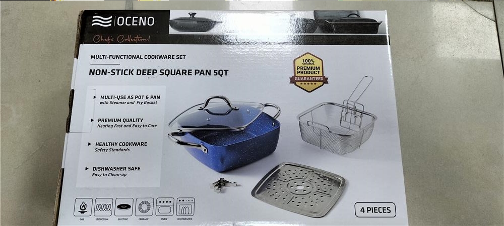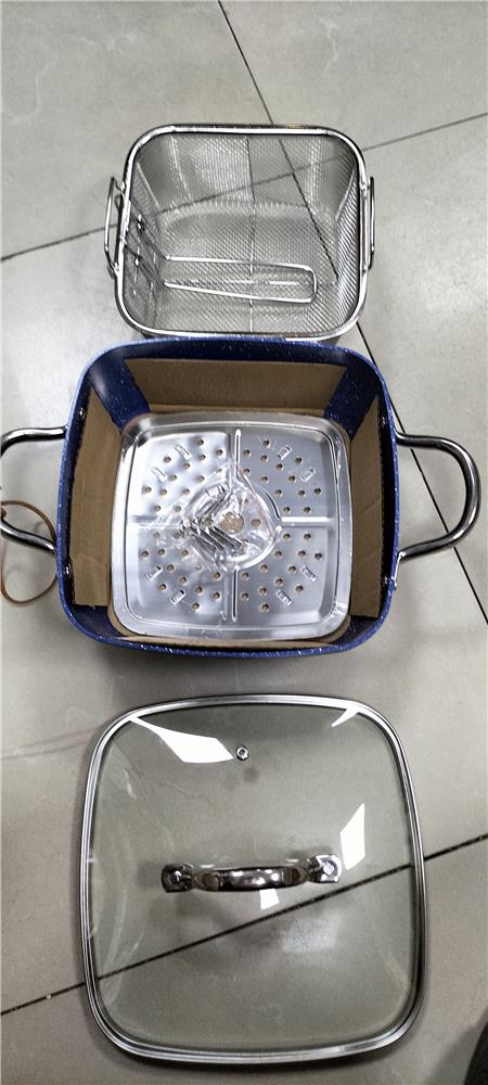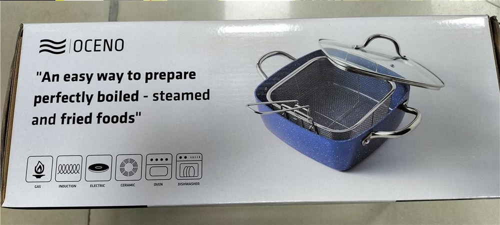 Nồi chảo vuông đa năng Oceno 24cm kèm vỉ hấp inox, giá vớt, vung kính. Đây cũng được coi như chiếc nồi chiên ngập dầu, sử dụng thêm giá vớt để vớt đồ chiên.