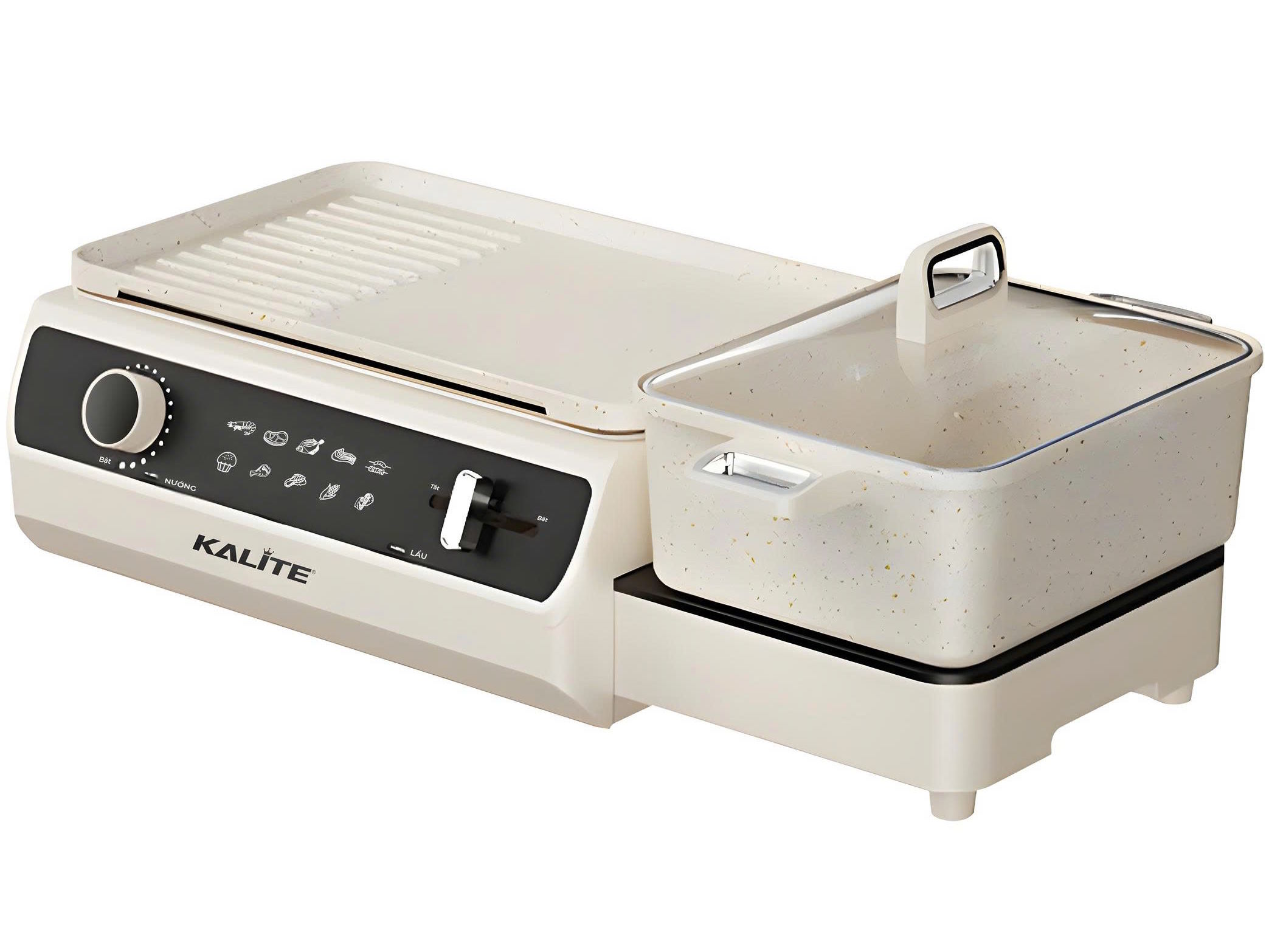Điểm nổi bật của Kalite KLG555 nằm ở thiết kế thông minh với hai vùng nấu tách biệt hoàn toàn gồm khay nướng kích thước 35 × 21,5 cm và nồi lẩu dung tích 3L. Nhờ cấu trúc này, người dùng có thể lựa chọn nấu riêng từng chức năng hoặc kết hợp cả hai trong cùng một bữa ăn.