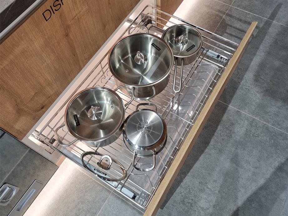 Rổ xoong nồi Hafele Cappella được thiết kế để tối ưu hóa không gian tủ bếp dưới. Bạn có thể dễ dàng sắp xếp các loại xoong, nồi và vật dụng nhà bếp cỡ lớn, giúp căn bếp luôn gọn gàng và khoa học. Thiết kế thông minh còn giúp tiết kiệm diện tích, đặc biệt hữu ích cho những tủ bếp có diện tích hạn chế.