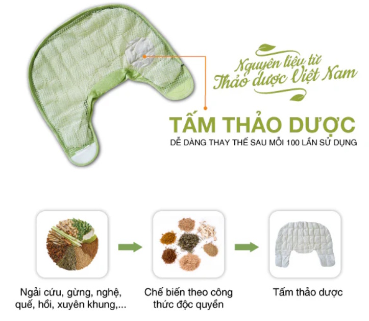 - Thành phần 100% thảo dược tự nhiên tại Việt Nam như: ngải cứu, gừng, thiên niên kiện, nghệ, xuyên khung, củ sả, quế, hồi, trần bì, bạch chỉ, cam thảo, tinh dầu tràm...