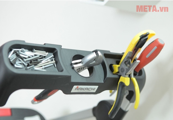 Ngoài ra, tay vịn của thang cũng giúp chúng ta đứng vững ở độ cao an toàn, và cũng có tác dụng mang vác dễ dàng hơn. Nếu đây là điểm nhấn nhá đầy ấn tượng của các loại thang nhôm ghế thông thường thì thiết kế kèm theo khay đựng dụng cụ chính là điểm cộng mà khách hàng dành cho Hakachi. Với thang nhôm ghế thông thường, bạn sẽ phải lên xuống thang nhiều lần để mang đồ dùng cần thiết lên nhưng với thang Hakachi thì không. Bạn chỉ cần đặt tất cả Ốc vít, tô vít, búa, cờ lê, mỏ lết, thước dây .... vào khay dụng cụ trên thang và ung dung làm việc.