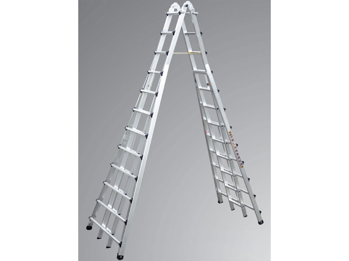 - Xếp hình chữ A với 2 loại (A1 gồm 2 x 12 bậc và A2 gồm 2 x 23 bậc) và nhiều kiểu hình chữ A lệch khác nhau phù hợp để làm việc ở những khu vực phức tạp như trên các bậc thang, nhà có mái vòm, địa hình đồi núi...