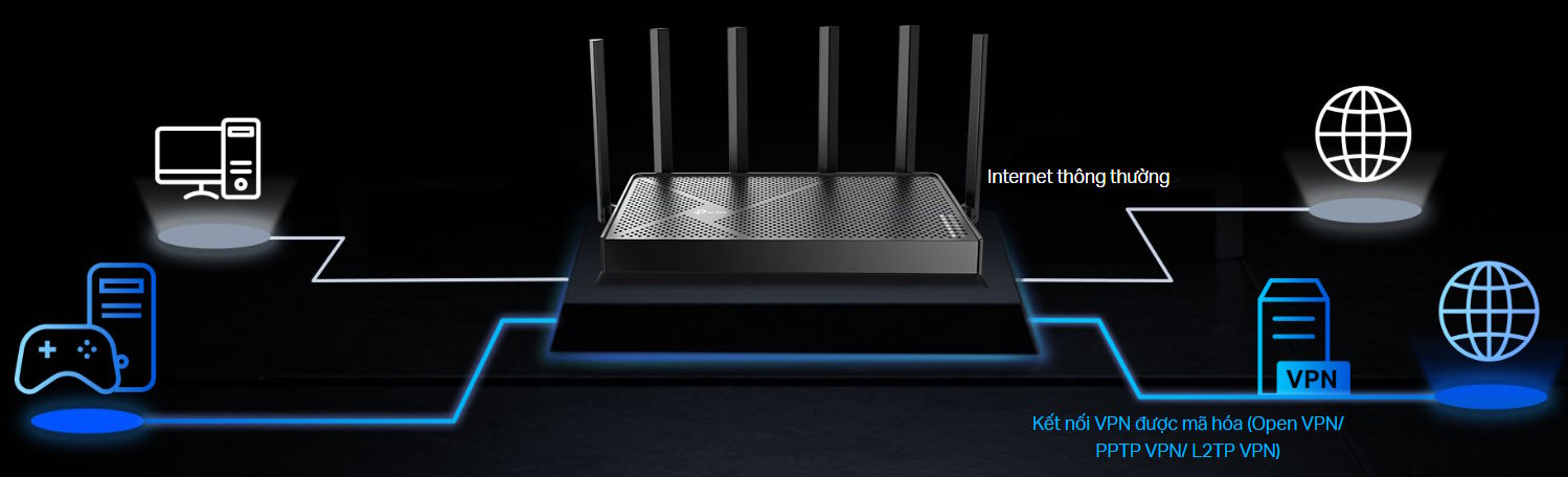 Archer BE600 cho phép thiết lập máy khách và máy chủ VPN, giúp các thiết bị trong nhà truy cập từ xa dễ dàng mà không cần cài đặt phần mềm riêng lẻ. Router có thể chạy song song VPN và Internet thông thường, đảm bảo sự linh hoạt và an toàn tuyệt đối trong môi trường làm việc online.